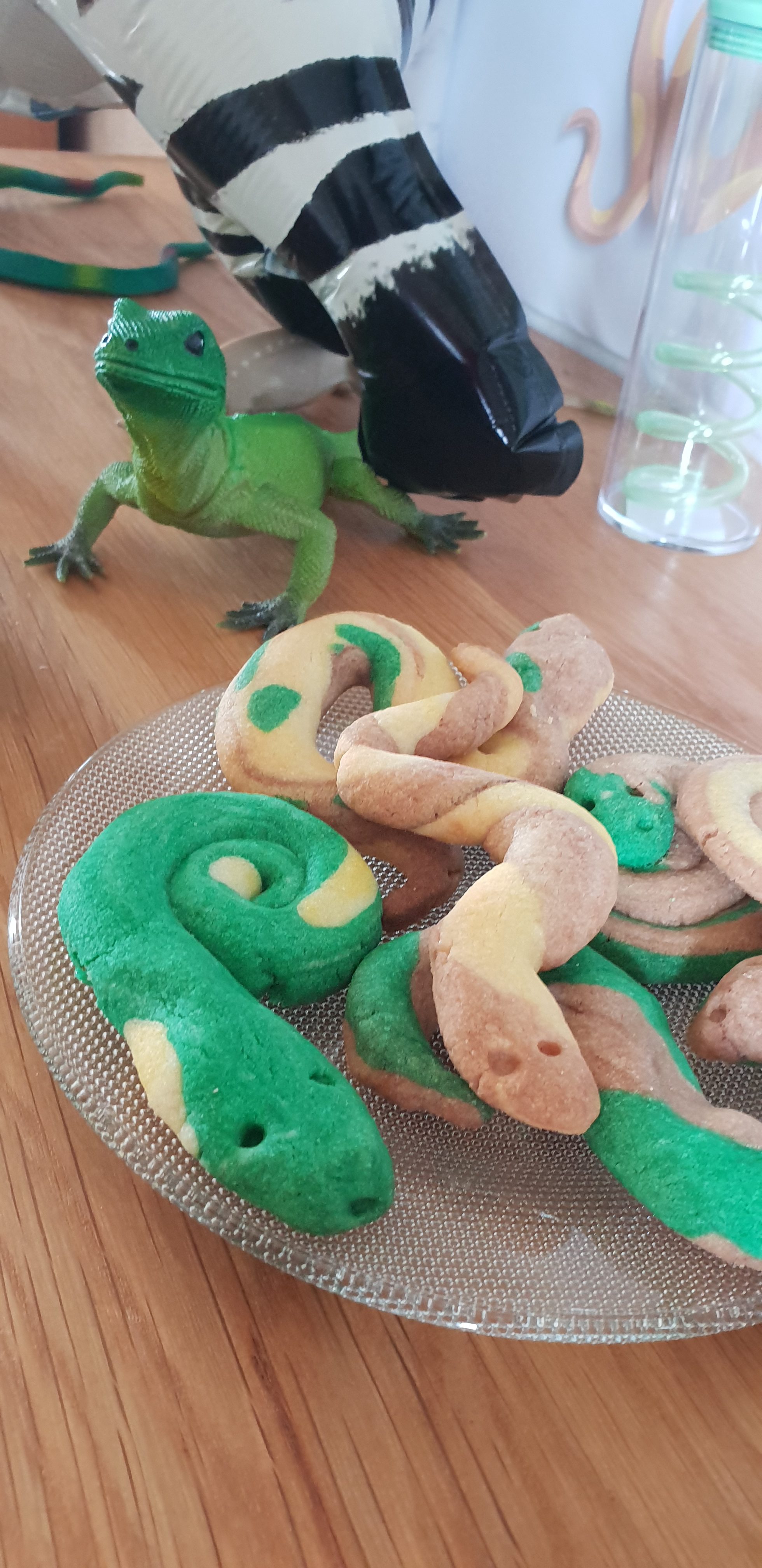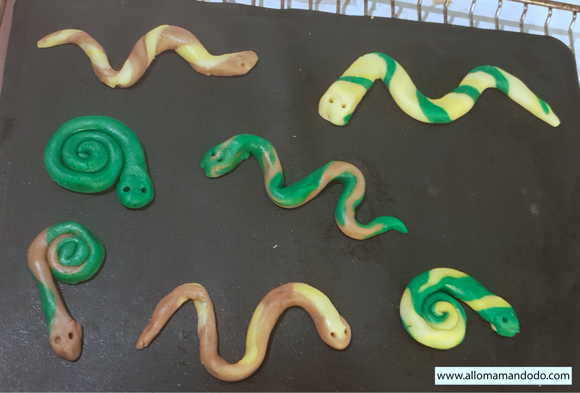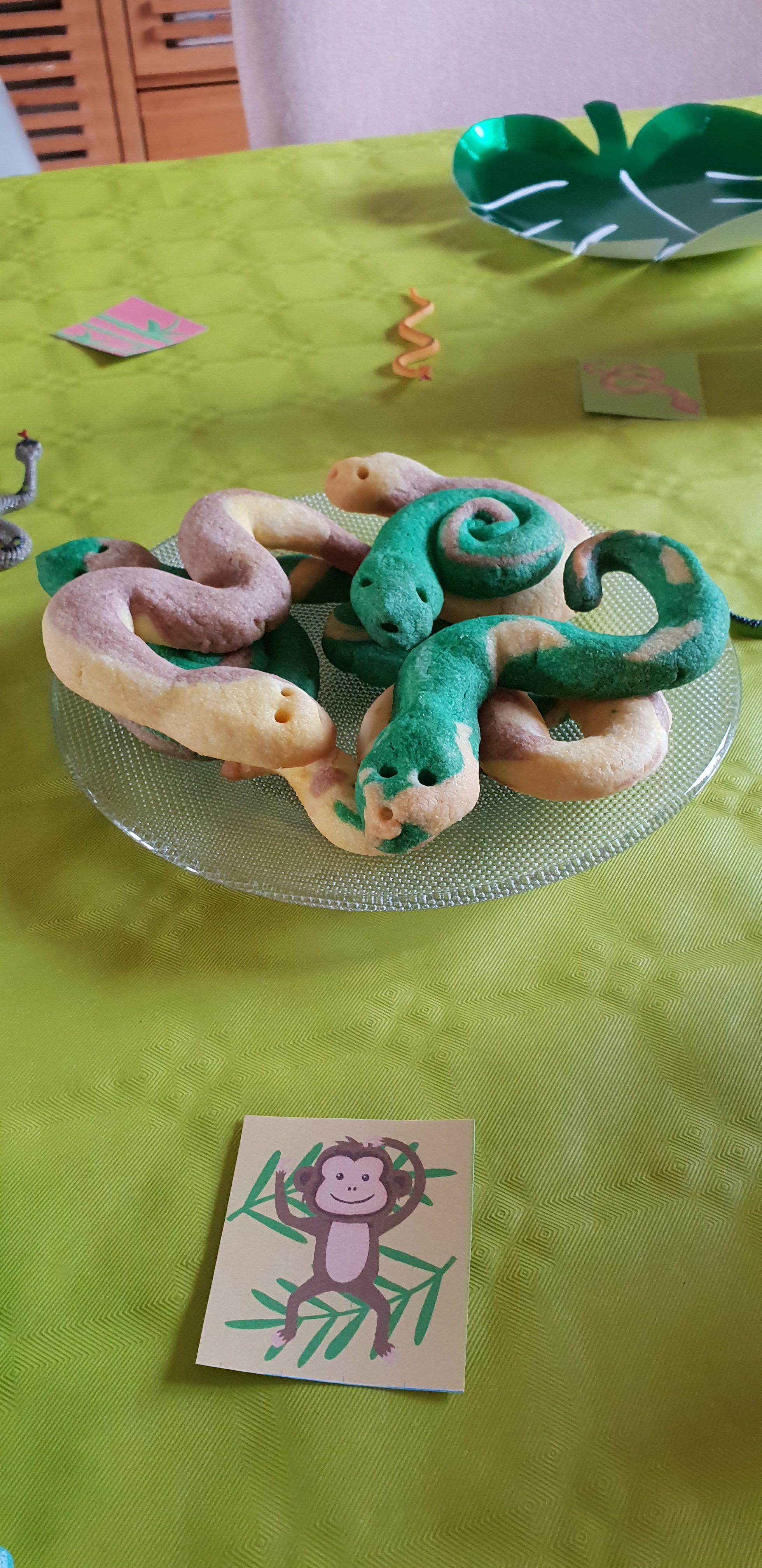 Pour l’anniversaire de PtitePomme, sur le thème JUNGLE, j’ai voulu lui créer des sablés marrants en forme de serpents!